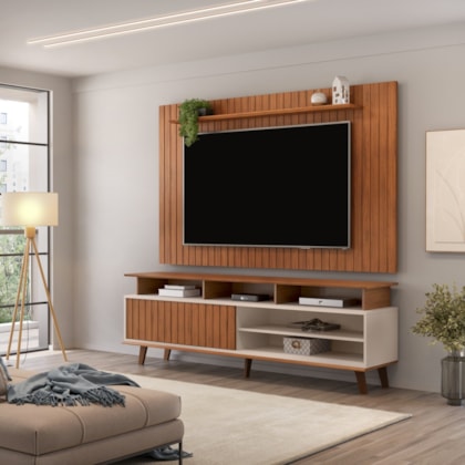 O Painel Frisado Lume e o Rack Flow combinam elegância e funcionalidade para transformar seu ambiente. O Painel Lume, ideal para TVs de até 65?, possui um sofisticado efeito ripado, prateleira chanfrada para destacar sua decoração e passa-fios integrado para organização dos cabos. Já o Rack Flow conta com porta deslizante frisada, nichos para eletrônicos e um tampo chanfrado que adiciona um toque refinado. Seus pés elevados proporcionam leveza ao design, enquanto o passa-fios integrado garante praticidade no dia a dia.