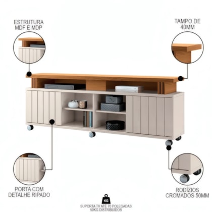 Para quem precisa de mais espaço e funcionalidade inteligente, o Rack Bancada Briz 1,80m da HB Móveis é a escolha ideal que une design compacto sofisticado e funcionalidade prática em perfeita harmonia. Desenvolvido especialmente para TVs de até 70 polegadas, este rack combina estrutura robusta em MDP/MDF, tampo generoso de 40mm que oferece resistência superior, duas portas de correr funcionais com detalhe ripado elegante, trilho de alumínio de alta performance, prateleiras removíveis versáteis e cinco rodízios cromados premium que garantem mobilidade fácil. Uma opção elegante e extremamente prática para organizar seus eletrônicos e decorar sua sala com sofisticação contemporânea, oferecendo acesso organizado a todos os seus equipamentos enquanto complementa harmonicamente a decoração do ambiente.