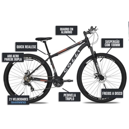 A Bicicleta Colli Toronto Alumínio Aro 29 Shimano 21v é a escolha perfeita para quem busca performance e conforto em suas aventuras sobre duas rodas. Com aro 29, ela oferece maior estabilidade e facilidade de rolagem, ideal para quem gosta de pedalar em diferentes tipos de terreno. Equipado com sistema de câmbio Shimano de 21 velocidades, você pode ajustar a marcha de acordo com a dificuldade do percurso, garantindo um desempenho superior em subidas, descidas e terrenos irregulares. O quadro de alumínio proporciona leveza e resistência, enquanto o sistema de freios a disco oferece maior segurança e controle.
