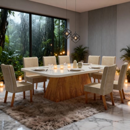 O Conjunto de Mesa Bom Pastor Bella combina elegância, resistência e conforto, ideal para compor salas de jantar amplas e sofisticadas.