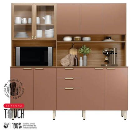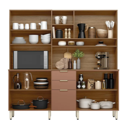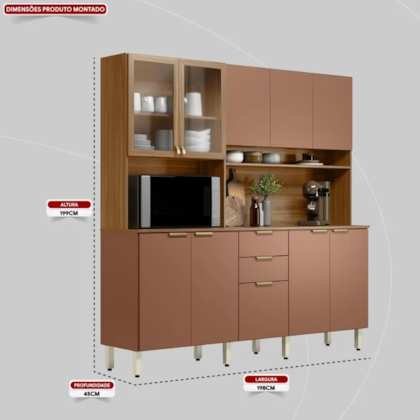 O Kit Cozinha Amora é a escolha ideal para quem busca organização, funcionalidade e elegância em um único móvel. Com design moderno e ótimo aproveitamento de espaço, ele oferece amplo armazenamento e espaço dedicado para o micro-ondas, deixando sua cozinha muito mais prática e charmosa. Produzido em MDP de 15 mm e 12 mm, o armário conta com 10 portas (sendo 2 com vidro de 3 mm), 2 gavetas com corrediças telescópicas e 5 prateleiras internas, proporcionando resistência, durabilidade e facilidade no dia a dia. Os puxadores em plástico e os pés com regulagem complementam o design moderno, além de facilitarem a limpeza e o nivelamento. Características: Modelo: Kit Cozinha Amora Estrutura: MDP 15 mm e 12 mm Dimensões: 198,2 cm (L) x 199,5 cm (A) x 45 cm (P) Profundidade superior: 26,8 cm 10 portas (2 com vidro de 3 mm) 2 gavetas com corrediças telescópicas 5 prateleiras (4 internas) Pés plásticos com regulagem Puxadores plásticos resistentes Peso suportado: até 78 kg distribuídos Requer montagem (manual e kit inclusos) Cores disponíveis: Nude Prime TX (fosco) Marsala Prime TX (fosco)