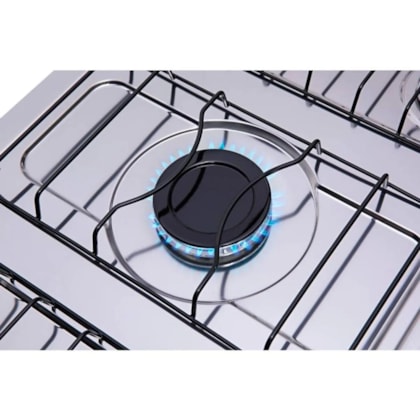 Possui mesa em inox, tampa de vidro na mesa, grades duplas de aço esmaltado, acendimento automático e botões removíveis que facilitam na hora da limpeza. 2 queimadores de 1,7 kW, 2 queimadores Família de 2,0 kW e 1 queimador Mega Chama de 3,0 kW. O forno possui visor amplo na porta, que permite enxergar tudo o que está dentro, capacidade de 86,5 litros, com dimensões de 64 x 30 x 45 cm, acabamento limpa fácil, 1 grade deslizante e porta com vidro duplo - que preserva o calor.