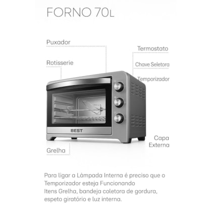Leve para sua cozinha a eficiência e o desempenho profissional com o Forno Elétrico BEST 70L Plus RL! Com 70L de capacidade, este forno é perfeito para assar grandes porções de carne, bolos, tortas e muito mais.Seus 6 modos de cozimento, combinados com um controle de temperatura preciso, garantem o preparo perfeito de suas receitas, com praticidade e qualidade.