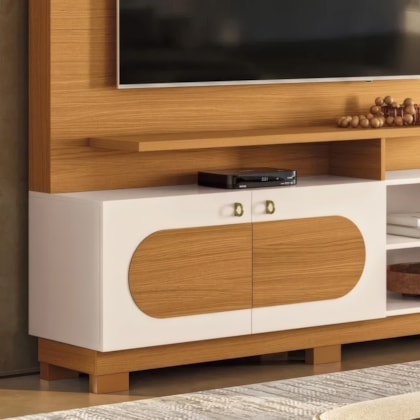 O Home Theater Axis 1,6m da HB Móveis, na combinação Cinamomo e Off White, é a união perfeita entre modernidade e sofisticação. Produzido em MDP com pintura UV resistente, é ideal para TVs de até 60 polegadas. Possui duas portas com dobradiças metálicas e puxadores dourados, tampo e prateleira superior robustos de 25mm, além de apliques decorativos curvos que enriquecem o design. Os pés elevados facilitam a limpeza do ambiente. É entregue desmontado com manual e todos os acessórios, sendo recomendada a montagem por um profissional.