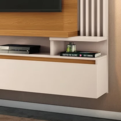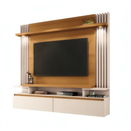 O Home Suspenso Cosmo para TV até 55" da HB Móveis possui um design elegante que revoluciona a decoração da sua sala. Com um detalhe decorativo em MDF ripado e duas luminárias de LED integradas, ele realça e valoriza o ambiente. Possui duas portas basculantes e é fabricado em MDP e MDF, unindo a beleza de um design diferenciado com a praticidade que você precisa.