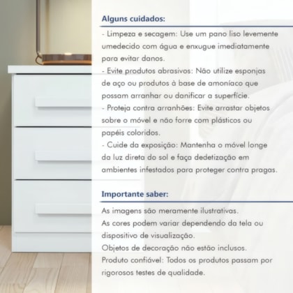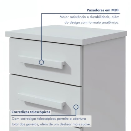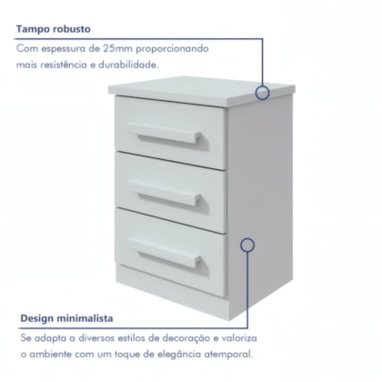 Praticidade e estilo se encontram na Mesa de Cabeceira Baião Plus Branca com 3 gavetas. Seu design moderno e acabamento fosco em MDP garante durabilidade, enquanto as gavetas com corrediças telescópicas metálicas oferecem organização suave para seus pertences. Ideal para complementar quartos compactos com elegância e funcionalidade.