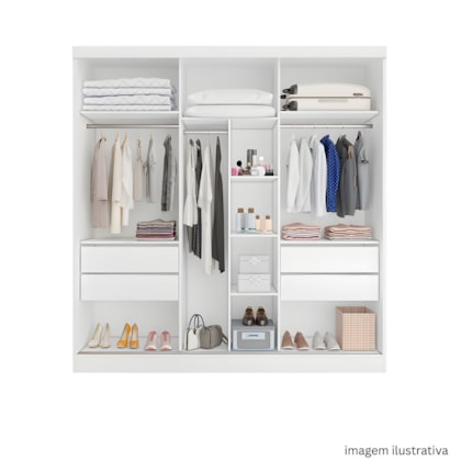 O Roupeiro Delta com Espelho Branco é solteiro ou casal com espaço interno bem dividido. Fabricado em MDP com portas em MDF, possui 3 portas de correr (uma com espelho de segurança), 4 gavetas com corrediças telescópicas, prateleiras centrais e espaço para roupas longas. Acabamento semi-brilho com trilhos em alumínio e ABS para durabilidade.
