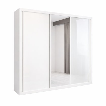 O Roupeiro Dallas 3 Portas com Espelho Branco da Bom Pastor em 100% MDF possui 3 portas (uma com espelho total peliculado), laterais e portas encabeçadas em MDF 25mm, 3 maleiros, várias prateleiras, cabideiros em alumínio e 4 gavetas profundas com corrediças telescópicas. Amplo espaço com organização refinada.