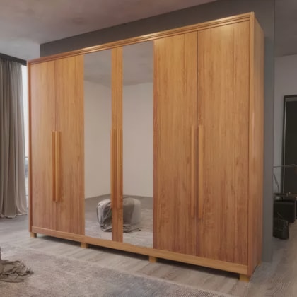 Amplo e organizado, o Roupeiro Sedan 6 Portas com Espelho em Naturale (100% MDF) possui 6 portas com puxadores, 2 portas espelho, 3 maleiros, várias prateleiras, cabideiros em alumínio e 6 gavetas profundas com corrediças telescópicas. Ideal para quartos grandes que demandam máximo armazenamento.