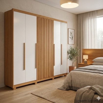 O Roupeiro Olimpo 6 Portas da Bom Pastor em 100% MDF possui 6 portas com puxadores, 2 portas ripadas real, 3 maleiros, várias prateleiras, cabideiros em alumínio e 6 gavetas profundas com corrediças telescópicas. Design moderno com detalhes ripados para quartos espaçosos e organizados.
