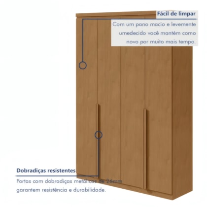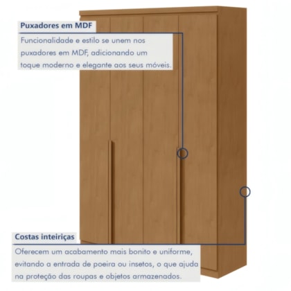 Funcional e elegante, o Guarda-Roupa Alonzo 4 Portas 2 Gavetas em Amêndoa (100% MDF) possui estrutura robusta com espessuras reforçadas. Oferece espaço interno otimizado com prateleiras distribuídas e gavetas com corrediças telescópicas metálicas. Perfeito para organização eficiente com design contemporâneo.
